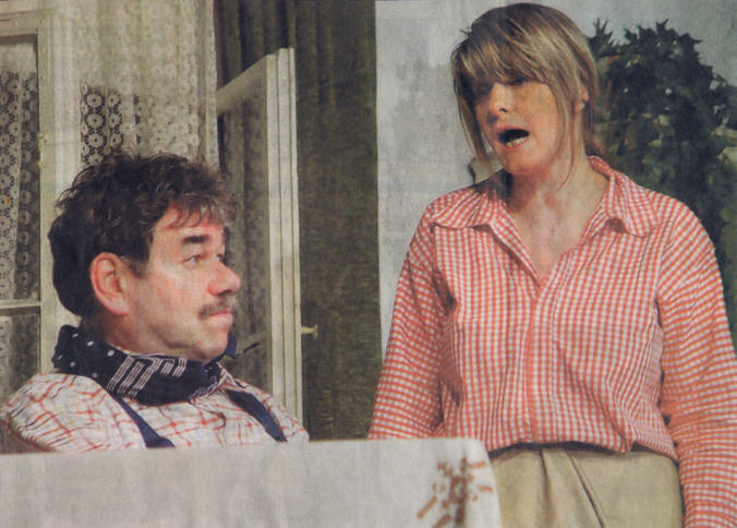 | Wie zwei Hanswurste: Knecht Heiner (Ludwig Holzer) und die störrische Magd Liesel (Corinna Steinke).